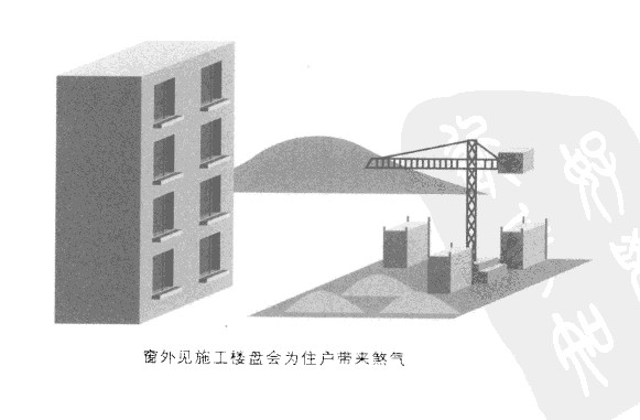 大厦对出的位置正有楼盘施工的话,正值搭棚时煞气便最大,因为有万箭穿心之象,对整幢大楼皆有影响;而在施工期间,所建筑的层数愈近自己所住的楼层,影响便愈大——例如当建筑到五楼,自己所住大厦的十至十五楼的问题便最为严重,如此类推。