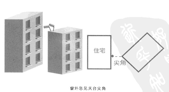 住宅的窗外忌正对另一妆大厦的天台尖角,如果住宅楼层对外的景观正是对着尖角位,住在宅内的人所受的损害当然最大,而对于愈底层的住户,这种尖角的风水影响便愈小——例如对面那形成尖角煞气的大厦有二十层楼高,而自己所居住的层数是在十八九楼或以下,根本看不见该大厦的尖角,因此你的家宅便不受煞气便最为严重,必须加以化解;至于住在二十二楼以上,影响则又会逐步递减。